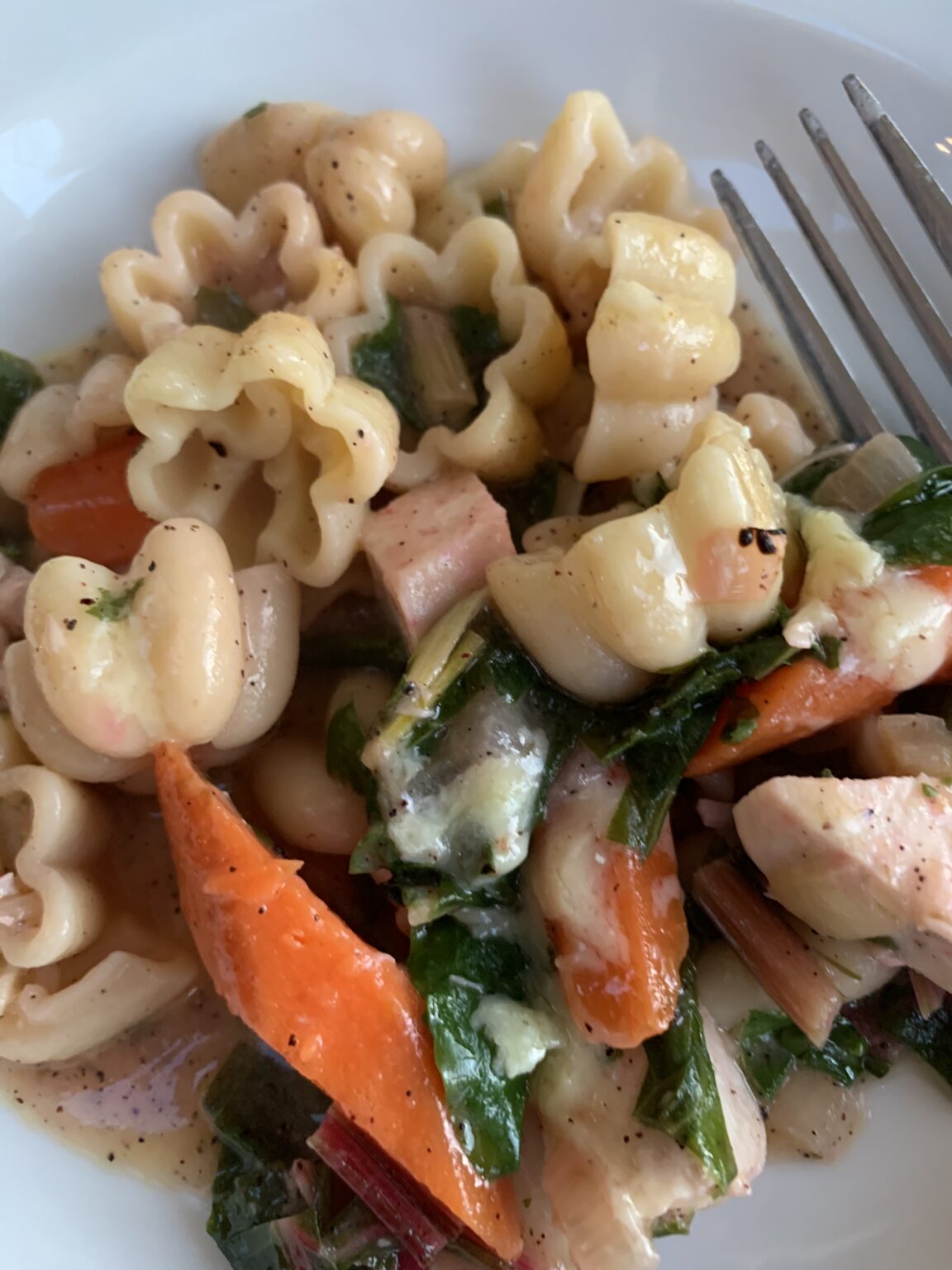 While the pasta cooks, I chopped the onion and sauteed in a saucepan with a little olive oil, then in the same saucepan, I made a simple sauce/gravy by melting 2 tablespoons butter into a saucepan, incorporating 2 tablespoons all purpose flour, stirring for about 2 minutes on medium low heat.  Add the chicken stock and continue whisking until it has slightly thickened.  Reduce heat to low.  I added the chicken, Swiss chard, and carrots and a sprinkle of the Sumac.  Stir, incorporating the ingredients.  When the pasta is cooked, drain, reserving about 1 cup of the water.  Add the pasta to the saucepan and stir.  If you want it to be a little more ‘saucy’ add a little bit more of the reserved pasta water.