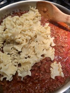 While the pasta is cooking, start cooking the meat mixture. They should be ready about the same time.