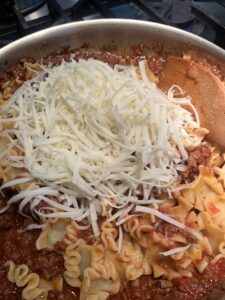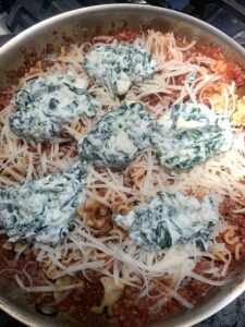 - Stir in the cooked pasta to the meat mixture then add ¾ cup of the mozzarella cheese, stirring to combine. Add 5 or 6 dollops of the Ricotta/spinach mixture on top and sprinkle remaining ¼ cup mozzarella over all.