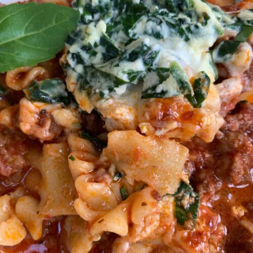 *Use 2 tablespoons red wine vinegar in place of the wine This recipe is also delicious with 1/2 ground beef and 1/2 Italian Sausage You can substitute 1 cup frozen spinach for the fresh spinach If you want to make this recipe a "White Deconstructed Lasagna", substitute Bechamel Sauce for the MarinaraWORKING AHEAD