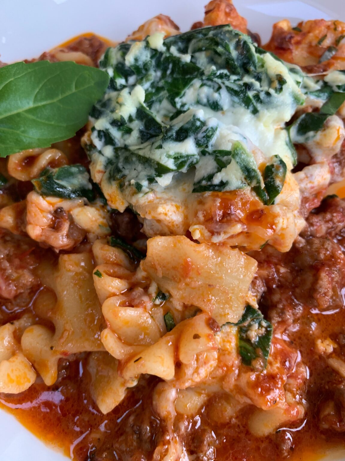 *Use 2 tablespoons red wine vinegar in place of the wine This recipe is also delicious with 1/2 ground beef and 1/2 Italian Sausage You can substitute 1 cup frozen spinach for the fresh spinach If you want to make this recipe a "White Deconstructed Lasagna", substitute Bechamel Sauce for the MarinaraWORKING AHEAD