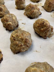 - Using a 2 tablespoon scooper or spoon, scoop meatball mixture and roll between your hands to form a (1½-inch) golf ball-size round meatball. Place on the prepared parchment-lined baking sheet and bake for 12-15 minutes, until lightly browned. Do not overbake!