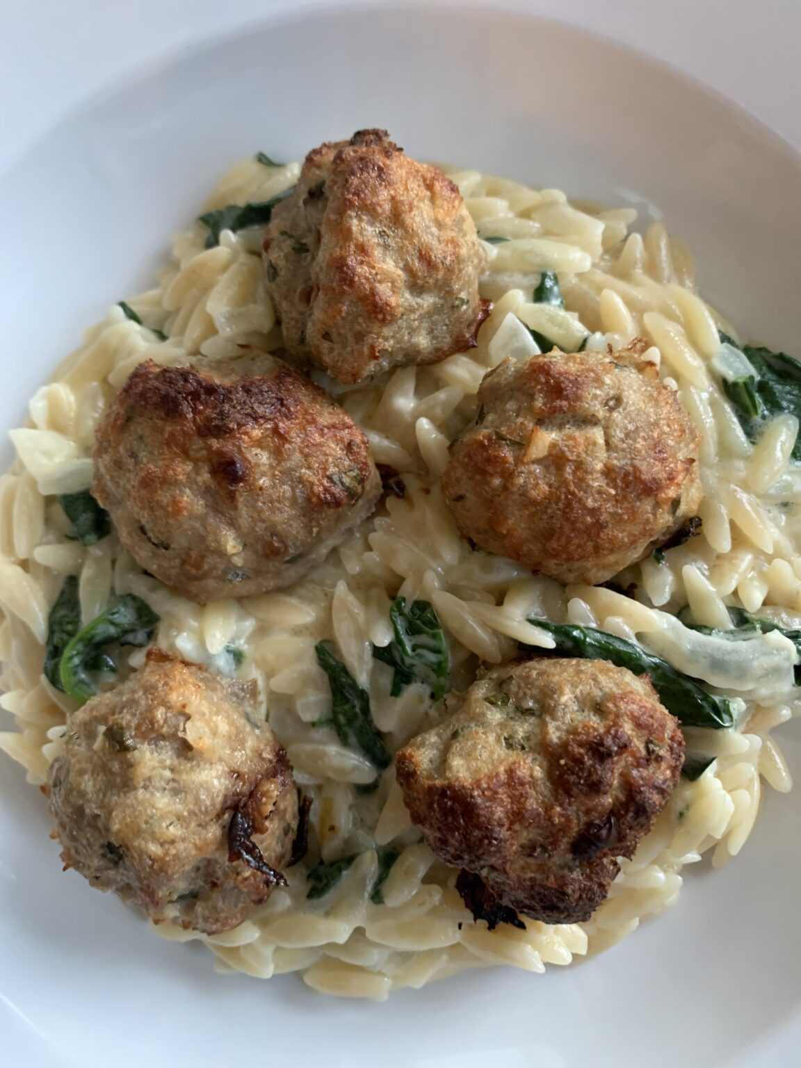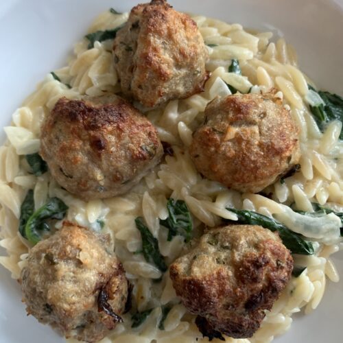 - The meatballs can be made and baked while you’re making the orzo, or you can make the meatballs another day, freeze and pull out the quantity you need. Substitute Chicken Meatballs-recipe found here