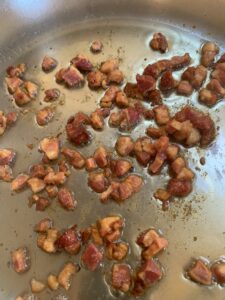 • Add the Pancetta and taste.  The Pancetta will bring more salt into the dish so you want to wait until the very end to add more salt.