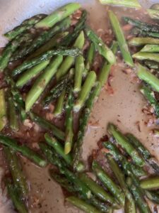• Add the shallot to the skillet and cook until translucent then add the garlic and asparagus