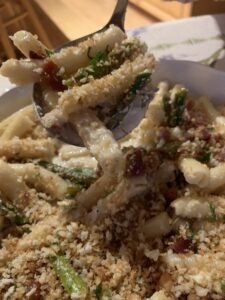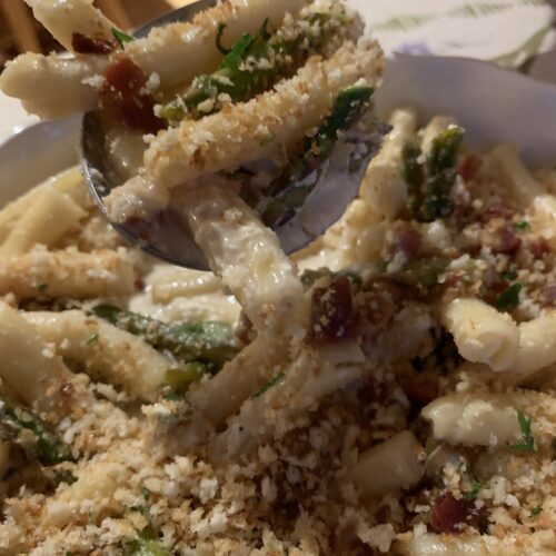 When spring is on the doorstep, I look for fresh asparagus to make a quick delicious dinner.  Get the pasta in the boiling water then start cooking the Pancetta then the vegetables.  Once the pasta is al dente, I turn off the heat but leave the pasta in the water.  Once I’ve added the creamy mascarpone I scoop about 3/4 cup of the starchy pasta water into the mix and stir it into a creamy sauce.  Taste for salt and pepper then add in the Pancetta and pasta, don’t worry about water that comes with the pasta, it will add more creaminess to the sauce.  Then let it simmer for about 5 minutes. Sprinkle with fresh parsley. Don’t skip the toasted bread crumbs!  It adds a little crunch to this dish.