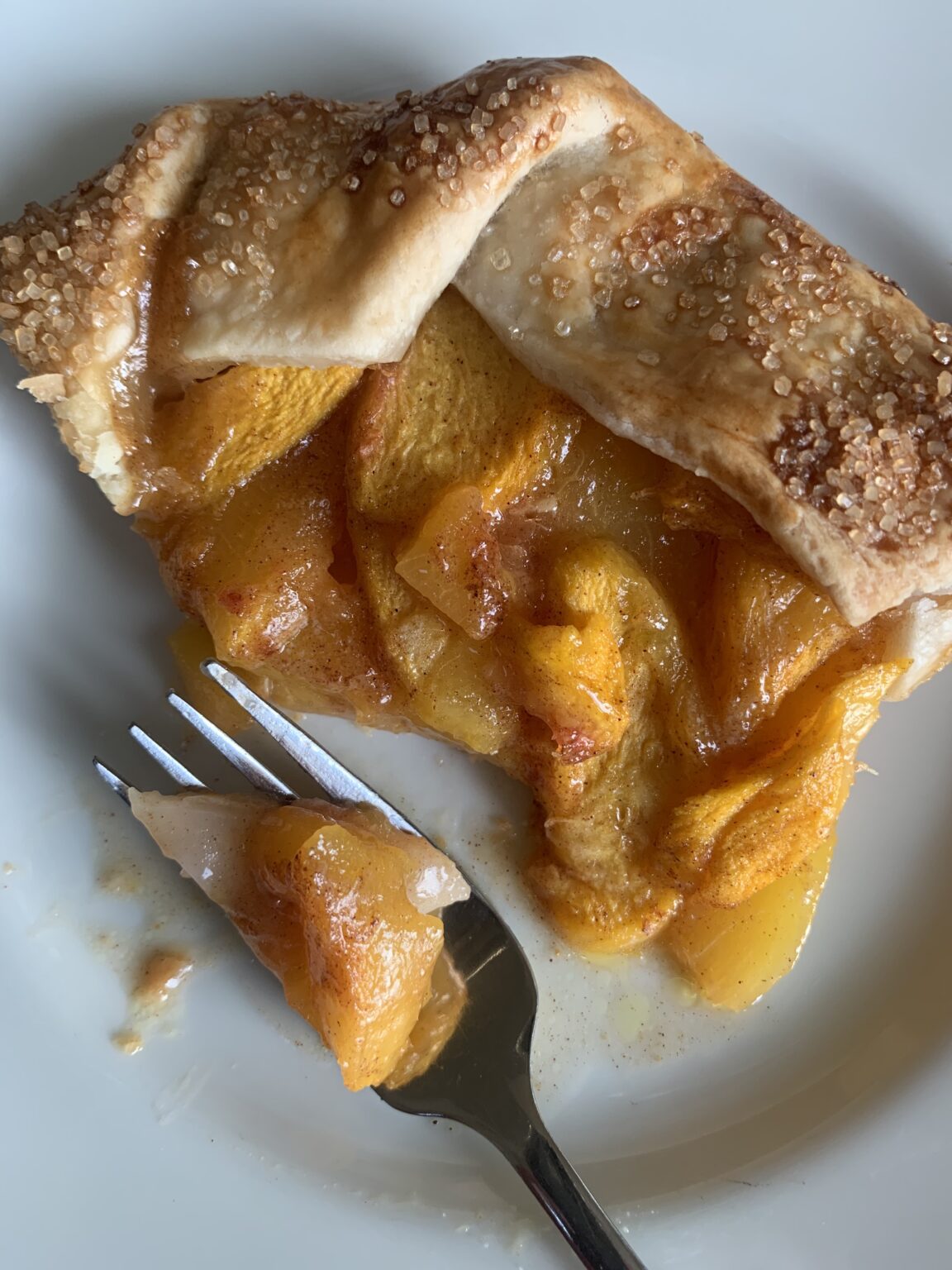 - Use a slotted spoon to scoop the peaches on to the pie dough. Too much of the juice will create a soggy galette.