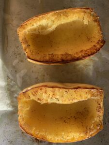 - Bake for about 30 minutes on the middle rack. Remove from the oven when it's cooked through and soft and browned around the edges. Turn the squash halves cut sides up