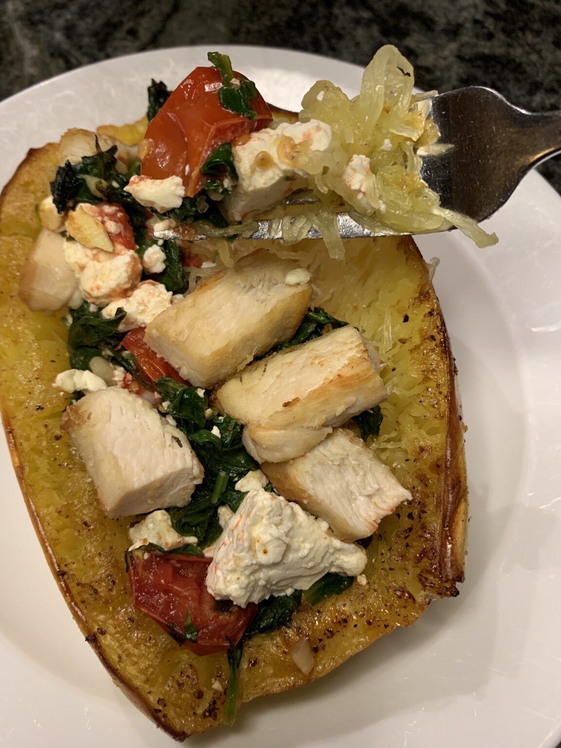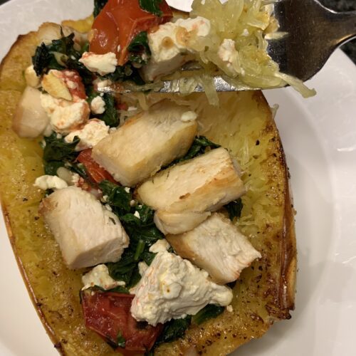 Roasted Spaghetti Squash with Spinach, Tomatoes and Feta Cheese