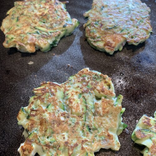 - Working in batches, scoop 2-3 tablespoon dollops of the zucchini mixture on to the hot pan. Use a spatula to flatten each one slightly. Fry until the bottoms turn golden brown, about 3 minutes, turn over onto the other side and fry until the second sides are golden brown, about 2 minutes. Transfer to the wire rack and sprinkle lightly with the flaky salt.